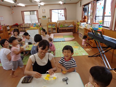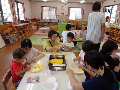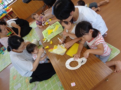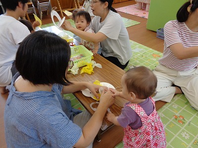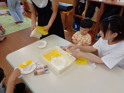 紙皿の底を切って、子どもたちがくしゃくしゃに丸めたお花紙を、ママたちがぐるっと貼っていきます。