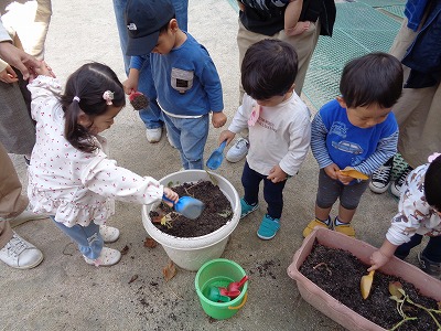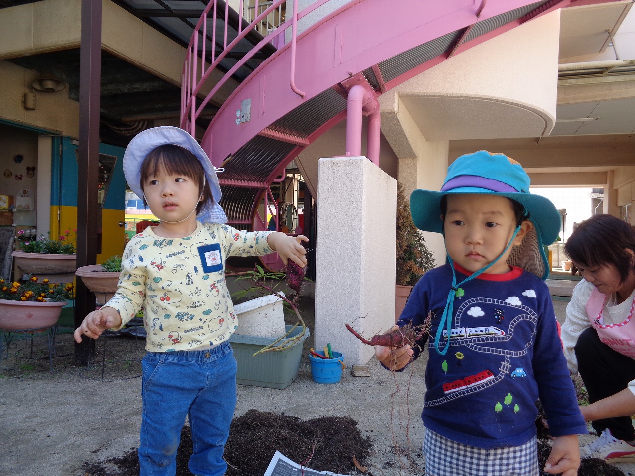 畑で育てたのと同じくらい、立派なお芋もありました。子供たちもママさんたちも、みんな大喜びで手に持ったり、近くでじっくり眺めたり。
