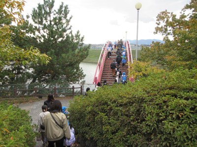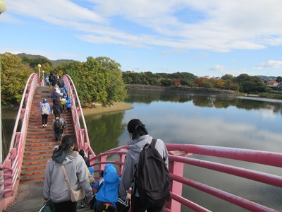 春日池公園の綺麗な景色を見ながら赤い太鼓橋を渡りました。