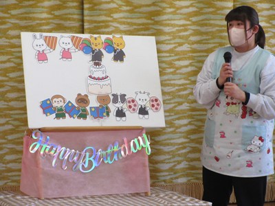 「ケーキ持ってきたよ!」みんなでお祝いしてあげようね!『お・た・ん・じょ・う・び・お・め・で・と・う!』