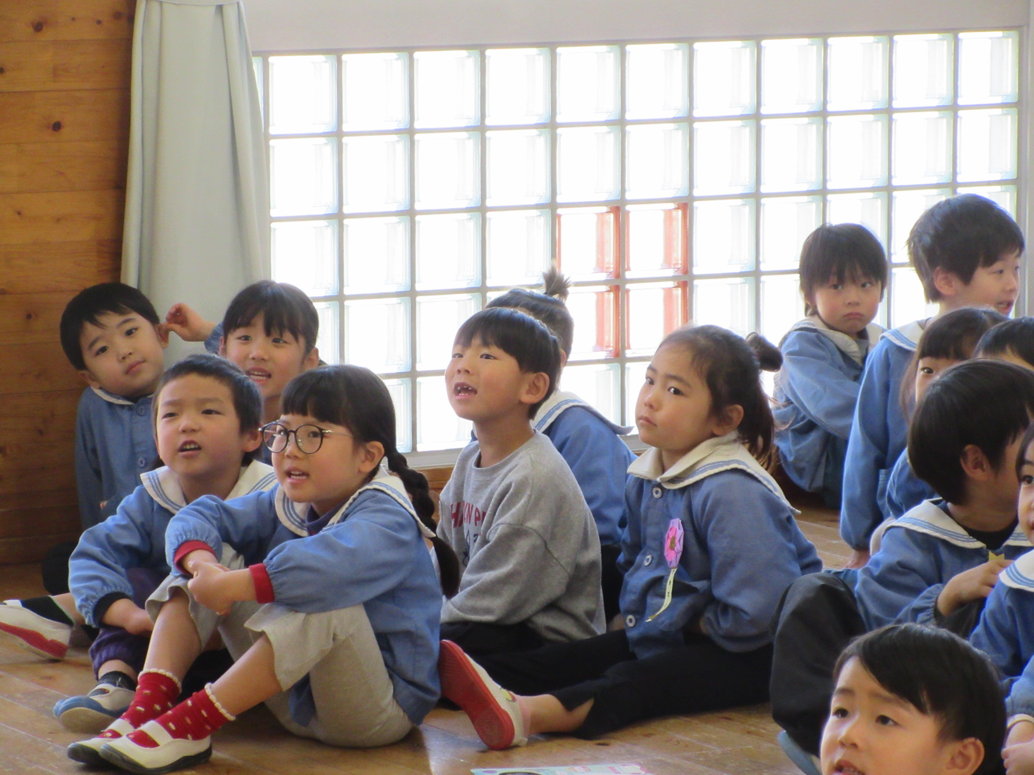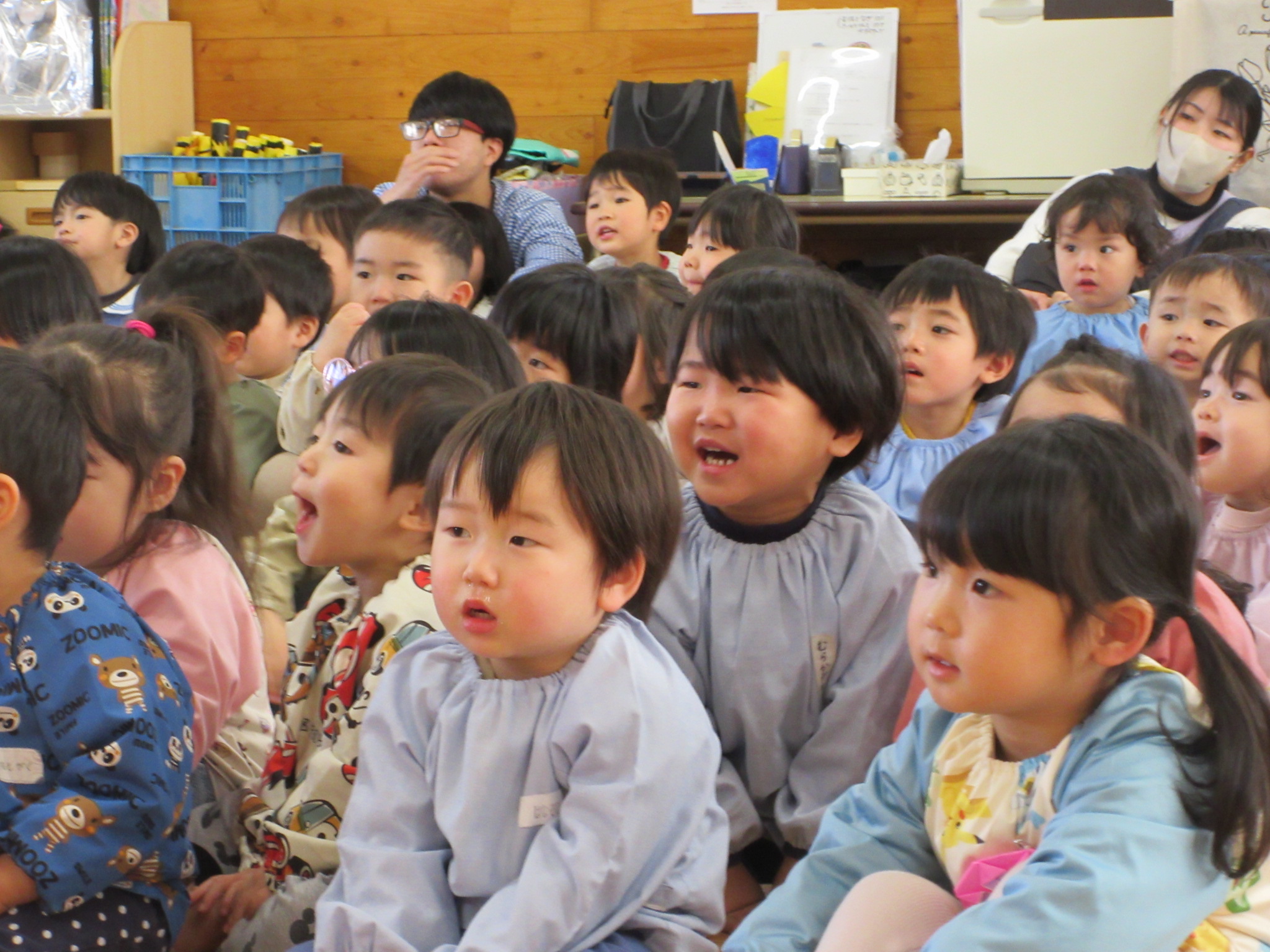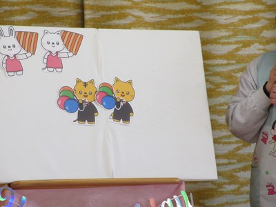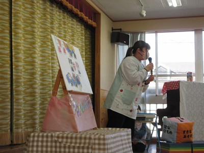 贈り物で顔を隠して登場してくる動物たちを見事に当てる子どもたちです。